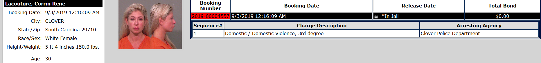30-year-old Corrin Lacouture was arrested by the Clover Police Department in South Carolina and booked into a jail in York County, South Carolina.