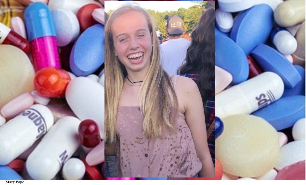 Mary Pope went to Charlotte Latin, pink fluid was found in her stomach along with pill residue